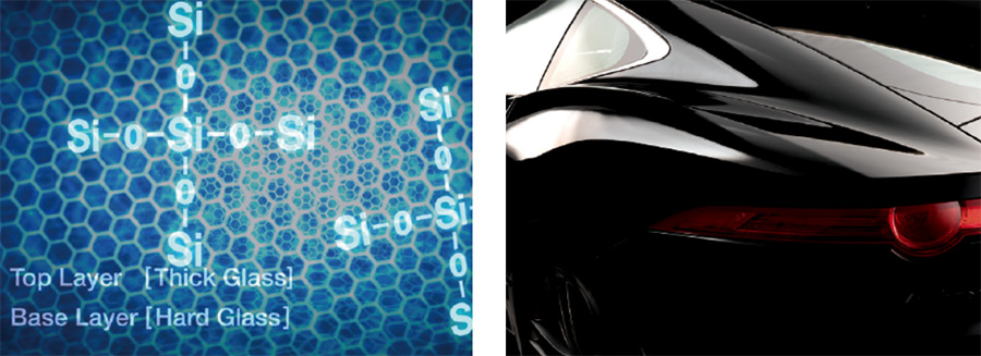 モース硬度8、クリスタルに匹敵する超硬質ガラス状被膜に従来を遥かに凌駕する驚異的な撥水耐久性能、深淵な艶を実現。