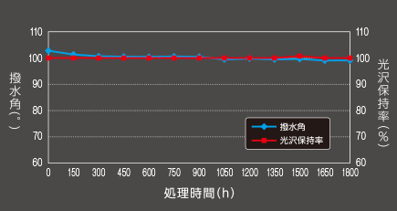 ガードグレイズは1800時間(1年相当)でも試験当初から安定した撥水角・光沢保持率を