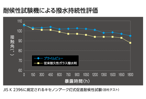 従来耐久ガラス撥水剤は時間の経過とともに接触角が鈍角化していったが、従来品に比べ、プライムビューは長時間のテストでも90度以上の接触角を維持した。