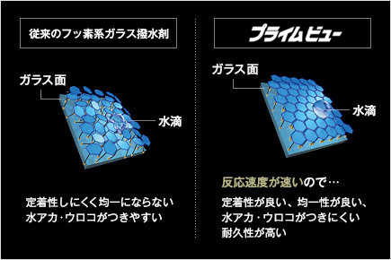 『プライムビュー』は従来のフッ素系ガラス撥水剤より定着性がよく、油や汚れをよせつけません。
